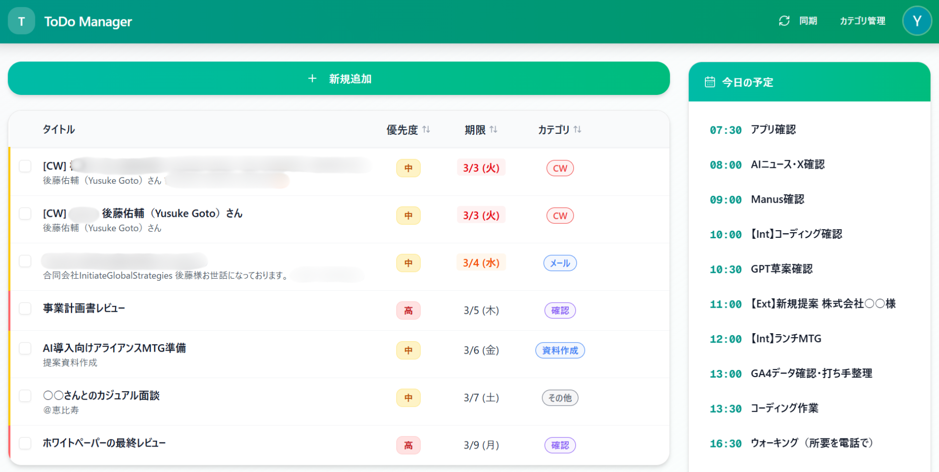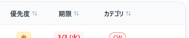 テーブル形式で一覧表示されていて、優先度・期限・カテゴリでソートできます。期限が過ぎたものは赤、当日のものはオレンジで表示されるので、「今日やるべきこと」がひと目でわかる。